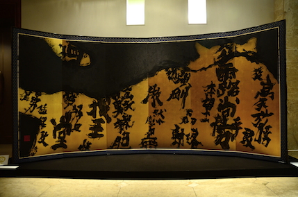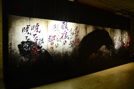 ■ 紫舟作品展示 Love Letter Project'13にて新作として発表した「天照白鯨」「月夜見鯨」は、昨年フランス国民美術協会展にて、サロン金賞を受賞 しました。本年の作品は、主賓招待作家として招待されている同展にて展示する新作「喰うカラス、喰われるカラス」や、 制作開始から3年、昨年N.Y.にて発表し本邦初公開となる、ライゾマティクスとのコラボレーション磁性流体作品「動き始めた書-Flow-」 などを展示しました。 ◎金屏風作品「喰うカラス、喰われるカラス」「我露豪放〜虎図」 ◎紫舟×ライゾマティクス コラボレーション作品「動き始めた書」 ◉ ギャラリートーク 12日には紫舟さんのギャラリートークも開催。 作品の説明、制作の経緯、作品への思いなどをお話され、大変貴重な時間となりました。 開催中、次第に人数も増え多くの方に参加頂きました。