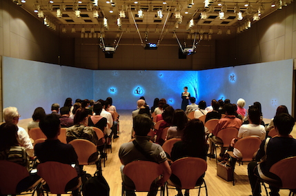 ■ 紫舟×チームラボ 新作「はじめて かみさまが おりたったころの ものがたり」 恒例となりました、紫舟×チームラボのデジタルアート作品展示。今回の新作「はじめて かみさまが おりたったころの ものがたり」は Love Letter Project 10周年ということもあり、今までの作品の集大成として制作されました。 舞い降りてくる文字に手を触れると絵となり動き始め、さらに絵に触れるとその絵のもつ力が一面に広がります。 触れれば触れるほどに美しく変化していき、タイトルの通り、新しい世界が創造されているかのような作品です。 全長24mの巨大スクリーンに投影され、コの字方でスペースも広く取れていたため子供達が走り回る姿が印象的でした。 今回は音響も4方向にスピーカーを設置、より立体感のある世界を体感できました。