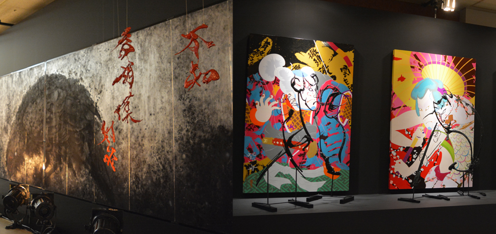 パリ・ルーブル美術館地下会場やミラノ・トリエンナーレ美術 館で展示され高評価を得た、絵と墨蹟彫刻が融合する〈嘴の折れたカラス〉の屏風画シリー ズ最新作や、書を3次元の立体彫刻として解放させ、360度から文字を鑑賞しその記号性と多面性を改めて問う意欲作「書のキュビズム」、さらに春画を題材とした〈紫艶由縁江戸花〉 を展示。今年も見応えのある展示となりました。